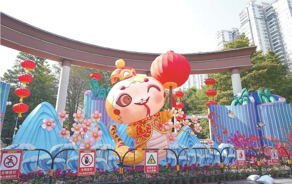 同样有蛇年元素的还有江滨公园众乐广场的“福到千万家”灯组。灯组整体采用福袋的造型,缀以中国结、铜钱串等元素,寓意新的一年,市民街坊福气满满、财运亨通。